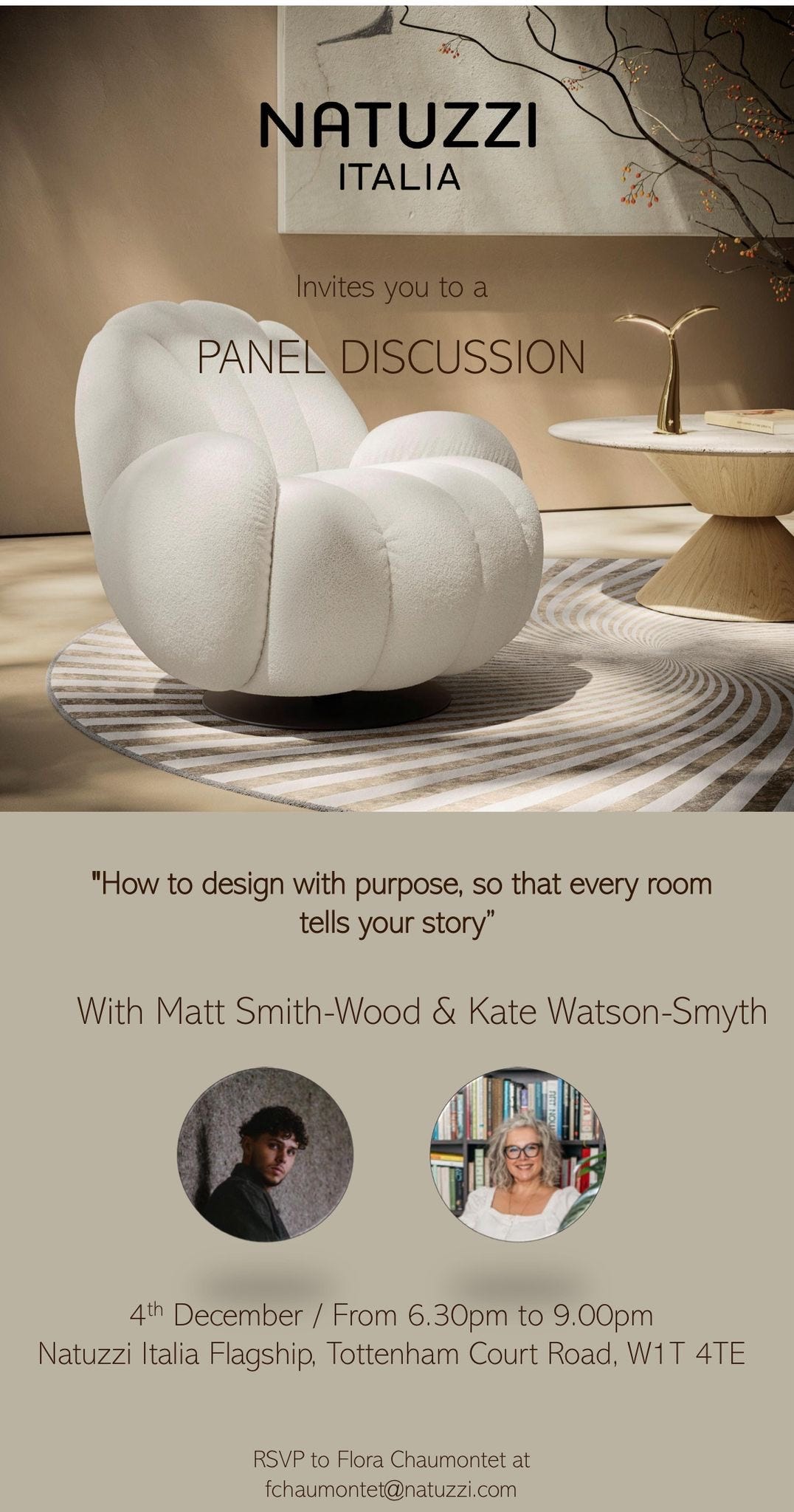 On Thursday 4 December, I will be in conversation with the designer, and BBC Interior Design Masters runner-up Matt Smith-Wood at the Natuzzi showroom in Tottenham Court Road. The evening starts at 6.30pm and Matt and I will be chatting about how to design a home with purpose and making sure that every room tells your story. Places are limited, so if you would like to come along please RSVP to Flora Chaumontet at fchaumontet@natuzzi.com.
