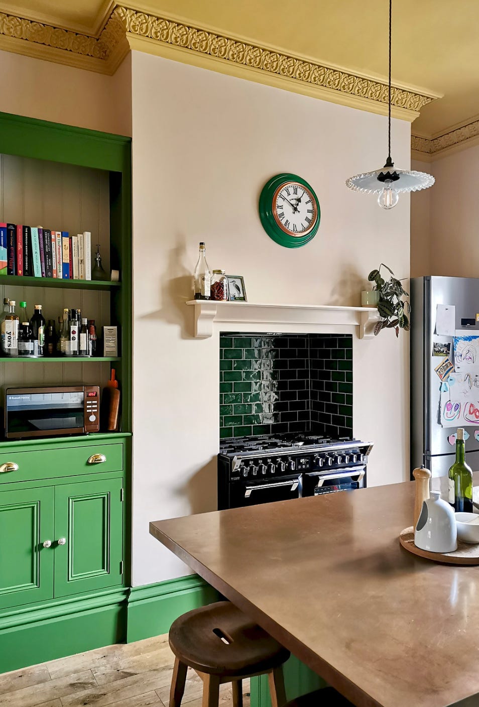 The ceiling is also a brilliant way to add a colour that you might find a little overwhelming if you had to stare at it all the time. If you look at the kitchen above and scroll so the ceiling is cut off you are looking at a classic pink and green room. It’s a strong green but you can flex that to your own taste – more olive, less bold, whatever works for you. The walls are a soft, pale plaster that brings warmth rather than overwhelming pinkness. The fireplace tiles are a darker green, the clock matches. Then there is that hit of strong mustard yellow on the ceiling that brings a wow moment, will definitely make it feel like the sun is shining all year round and – more important than both of those things – makes it feel like it’s a room that belongs to a real person and not just another kitchen.